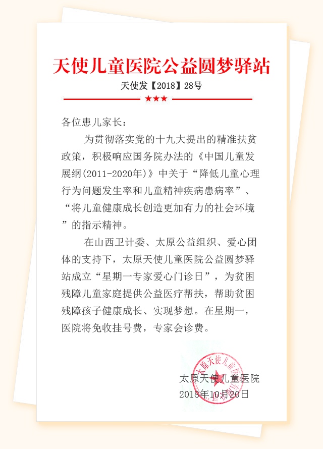 为贯彻落实党的十九大提出的精准扶贫的政策,太原天使儿童医院成立“山西天使儿童公益圆梦驿站”呼吁社会共同关注贫困弱势患病儿童。在省卫计委、太原公益组织、爱心团体的支持下,太原天使儿童医院成立“星期一专家爱心门诊”。